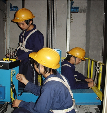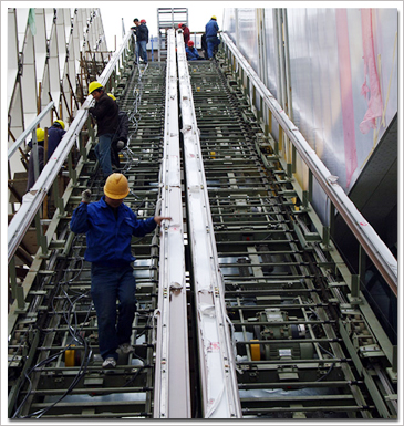 | 自動扶梯安裝時,兩側應搭設腳手架,便于兩側的安裝。工作時應載好安全帽,系好安全帶及工具代等,凡進行帶電工作時必須兩人以上,電源開關應派專人看管,如遇必要進入機架內部調整,必須將電源插座拔下,專人看管人員不能離開電源插座處,以免發生意外。試運行時必須通知無關人員離開,并在自動扶梯的上下出入口處設立警示牌“不準通行,不準靠近”字樣。試運行時還應檢查是否遺有工具及其它雜物在機架內,確認正常后方能通電試運行。 |